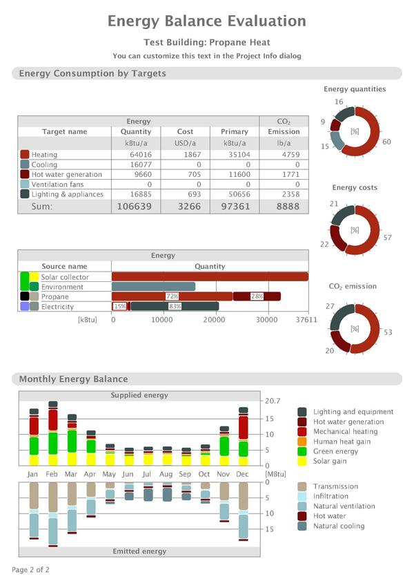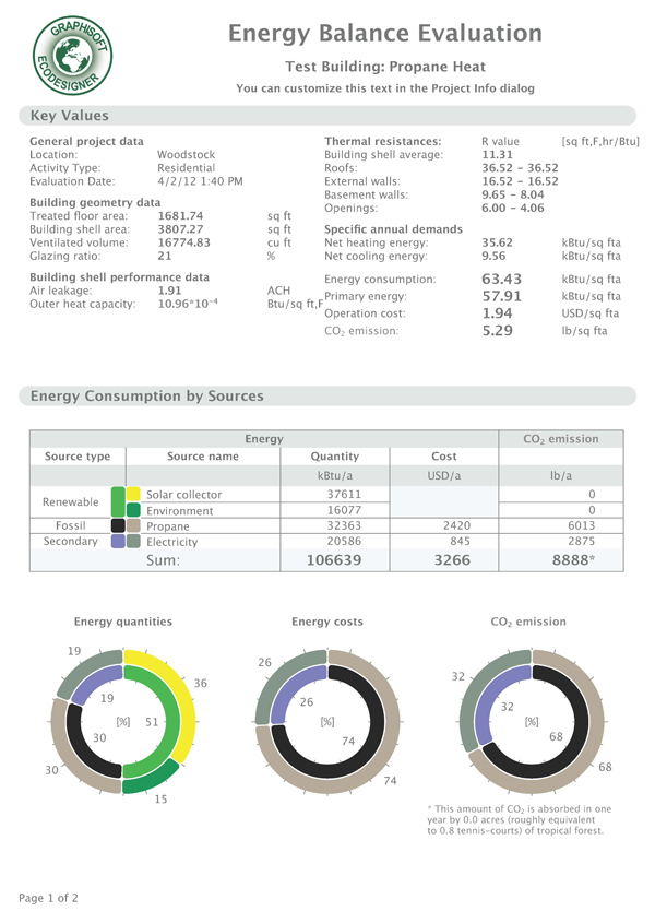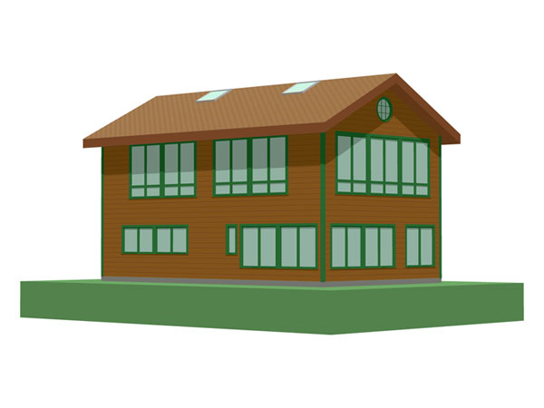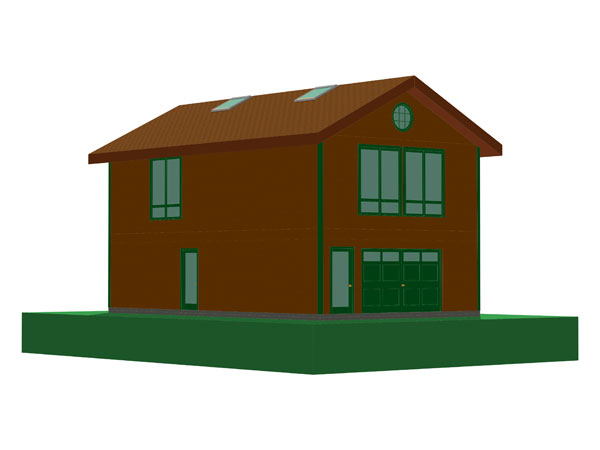 This view shows the northeast and northwest faces of the building. Note that there are considerably fewer windows than the south faces. The two reports compare the operating costs and carbon footprint using propane and wood as heating fuel. You may also compare oil as fuel by viewing the south orientation report to the left.